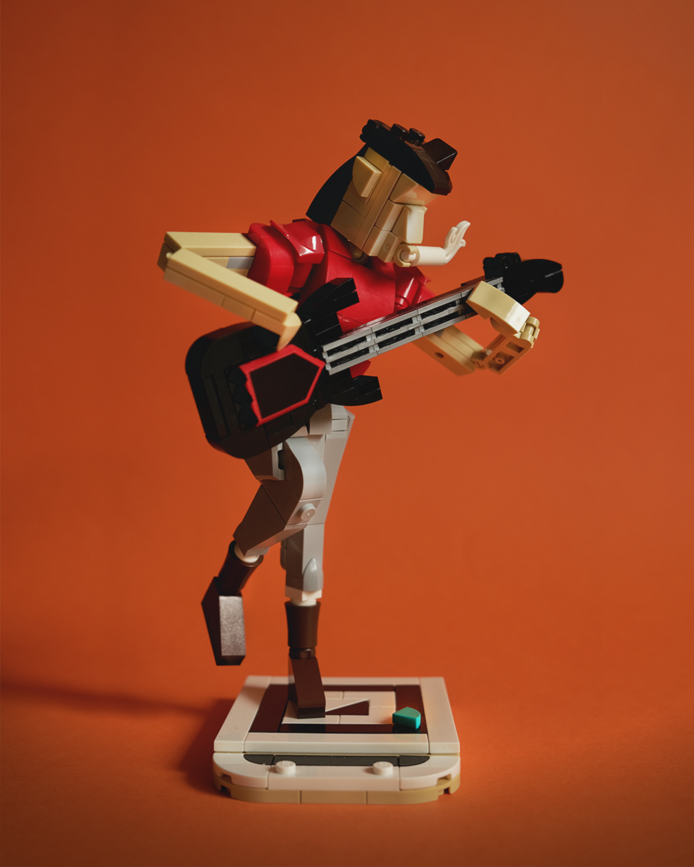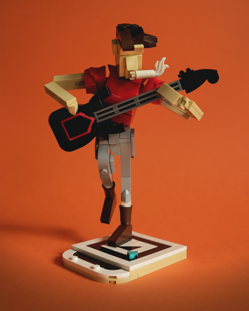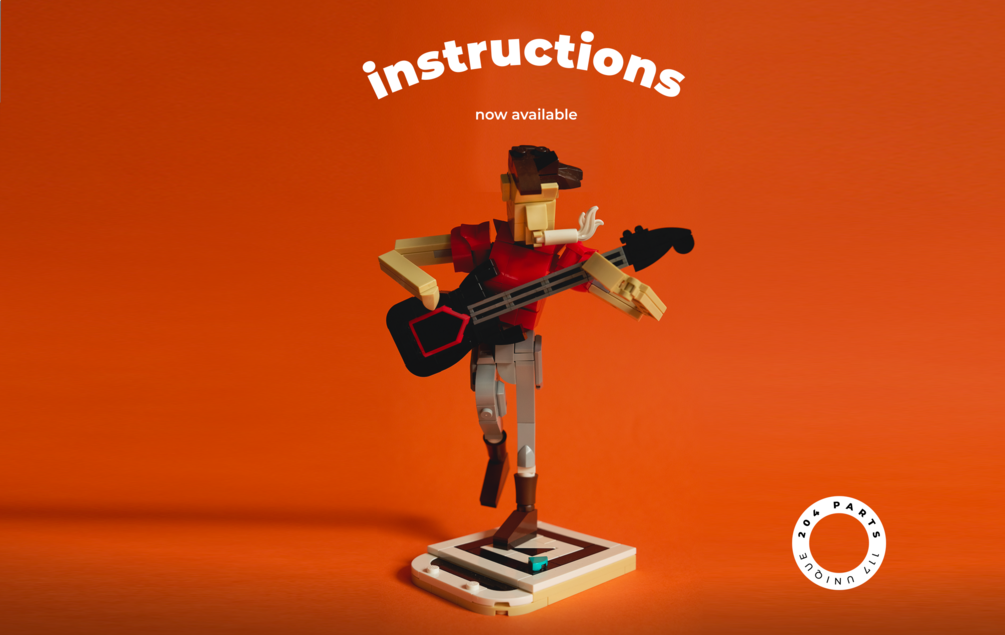 The inspiration for the model is the exquisite Jazz Quartet 21334 by @lego7_creation, some of our characters on LEGO Masters AU, as well as my favourite lead guitarists: Tom Morello, John Frusciante, Mark Knopfler, and David Gilmour. Of course, the character is the same scale as the musicians in Jazz Quartet and he's a perfect addition to the set if you're looking for an extra band member.